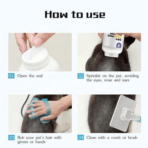 استفاده از آن آسان است، به سادگی پودر را روی مو حیوان خود بپاشید، ماساژ دهید و سپس آن را برس بزنید. این شامپو برای پت های در هر سنی و هر نژادی بی خطر است و می توان از آن به طور منظم یا در صورت نیاز استفاده کرد.